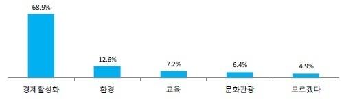 지역경제활성화 68.9%, 환경 12.6%, 교육 7.2%, 문화관광 6.4%