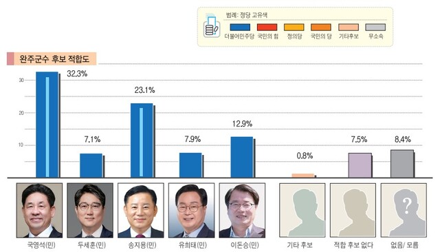 국영석 현 고산농협조합 20.3%, 송지용 현 전북도의회 의장 16.4%, 이돈승 현 더불어민주당 선대위 조직부본부장 14.8%, 유희태 현 더불어민주당 정책위 부의장 13.5%, 두세훈 현 전북도의원 9.7%, 소병래 전 전북도의회 부의장 4.9%. 적합후보 없음과 모름 등 유보층 18.2%