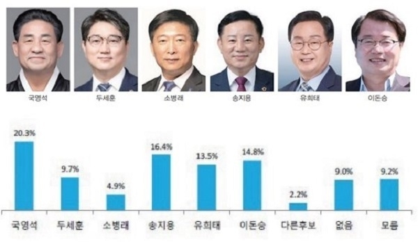 - 30~39세에서는 국영석 전 도의원과 송지용 의장이 각각 26.0%와 22.8%를 기록하며 경쟁력을 보였다.