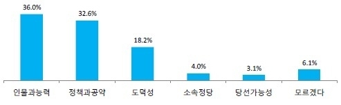 인물과 능력 36.0%, 정책과 공약 32.6%, 도덕성 18.2%, 소속정당 4.0%, 당선가능성 3.1%