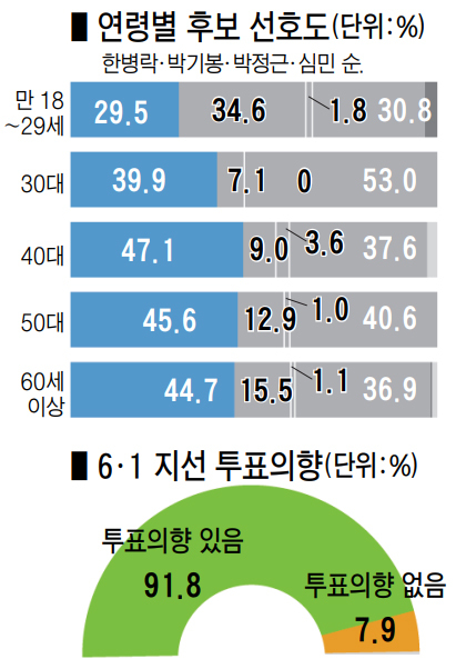 - 연령별로 보면 한완수 도의원이 30세 이상 39세 이하 연령(28.0%)을 제외하고 모든 연령에서 30% 이상의 지지를 얻었다.