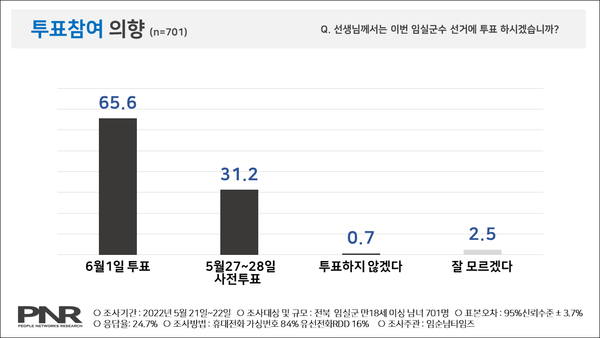 * 이번 조사는 임순남타임즈가 여론조사 기관인 PNR (주)피플네트웍스 리서치에 의뢰해 전라북도 임실군에 거주하는 만 18세 이상 남녀 701명을 대상으로 5월 21일, 22일 이틀간 휴대전화 가상번호 7,996개를 무작위 추출해 휴대전화 가상번호 84%, 유선전화 주요국번 3개 0001~9999 생성 후 무작위 추출 2만9,997개를 무작위 추출해 유선전화 RDD 16% 자동응답전화조사 방법으로 진행됐다. 응답률은 24.7%, 표본오차는 95% 신뢰수준에서 ±3.7%p, 지역별-성별-연령별 가중치를 부여(2022.2월 행정자치부주민등록 인구기준)했으며 세부 질문내역은 중앙여론조사심의위원회 홈페이지에서 확인할 수 있다.