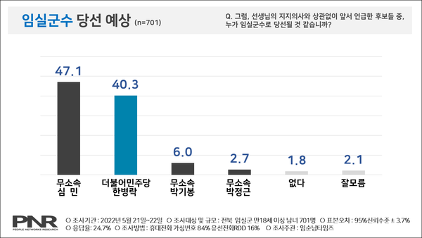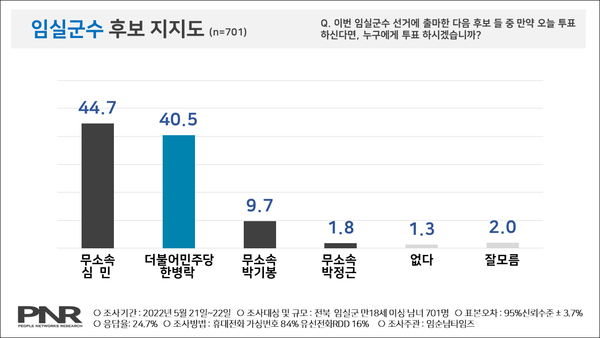 임순남타임즈 의뢰, 피플네트웍스 리서치 5월 21일~22일 전라북도 임실군에 거주하는 만 18세 이상 남녀 701명 대상 조사