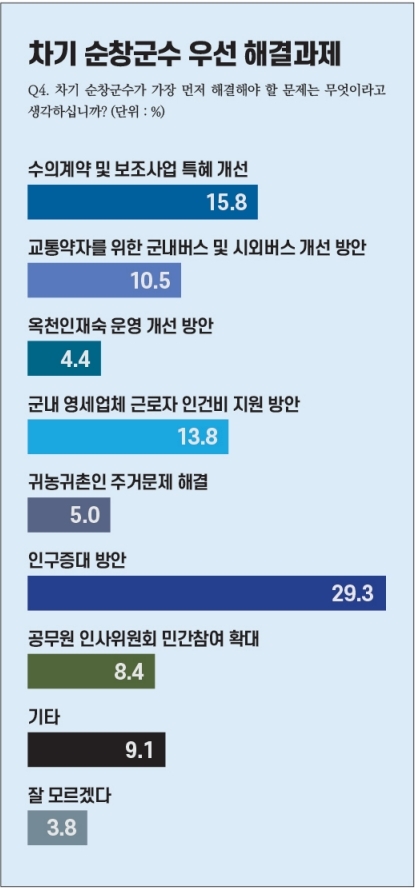 인구증대방안 29.3%, 수의계약 및 보조사업 특혜 개선 15.8%, 군내 영세업체 근로자 인건비 지원 방안 13.8%, 교통약자를 위한 군내버스와 시외버스 개선 방안 10.5%, 공무원 인사위원회 민간참여 확대 8.4%, 귀농귀촌인 주거문제 해결 5.0%, 옥천인재숙 운영 개선 방안 4.4%, 기타 9.1%, 잘 모르겠음 3.8%