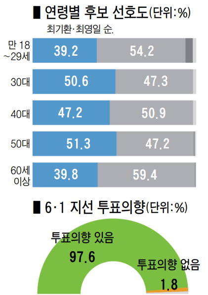 - 반면 민주당 최기환 후보는 30~40대 젊은 층에서 높은 지지를 받았다.