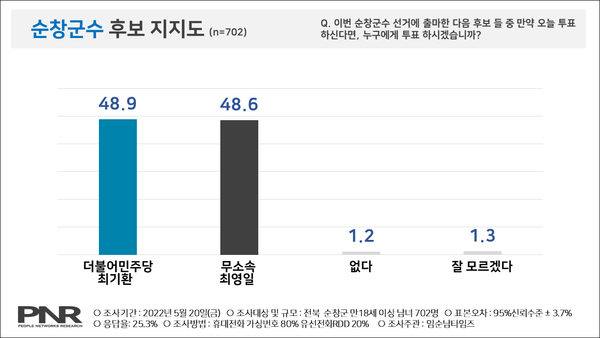 * 이번 조사는 임순남타임즈가 여론조사 기관인 PNR (주)피플네트웍스 리서치에 의뢰해 전라북도 순창군에 거주하는 만 18세 이상 남녀 702명을 대상으로 5월 20일 휴대전화 가상번호 8.233개를 무작위 추출해 휴대전화 가상번호 80%, 유선전화 주요국번 2개 0001~9999 생성 후 무작위 추출 1만9,998개를 무작위 추출해 유선전화 RDD 20% 자동응답전화조사 방법으로 진행됐다. 응답률은 25.3%, 표본오차는 95% 신뢰수준에서 ±3.7%p, 지역별-성별-연령별 가중치를 부여(2022.2월 행정자치부 주민등록 인구기준)했으며 세부 질문내역은 중앙여론조사심의위원회 홈페이지에서 확인할 수 있다.