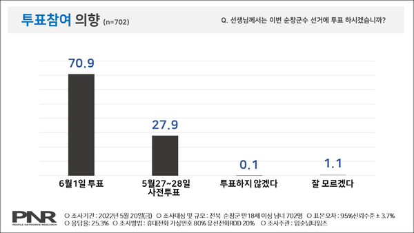 임순남타임즈 의뢰, 피플네트웍스 리서치 5월 20일 전라북도 순창군에 거주하는 만 18세 이상 남녀 702명 대상 조사