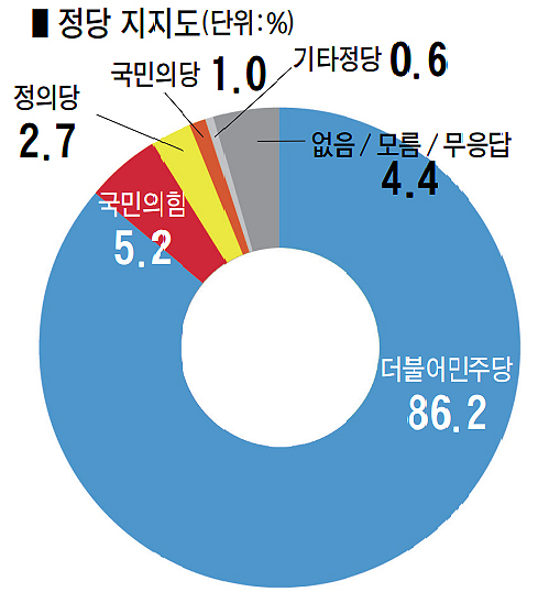 민주당 86.2%, 국민의힘 5.2%, 정의당 2.7%, 국민의당 1.0%
