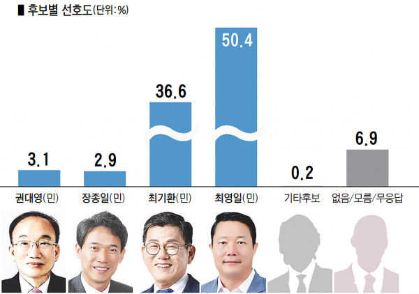 더불어민주당 최기환 후보 49.0%, 무소속 최영일 후보 49.7%, '지지 후보가 없다' 0.7%, '잘모름' 0.5%