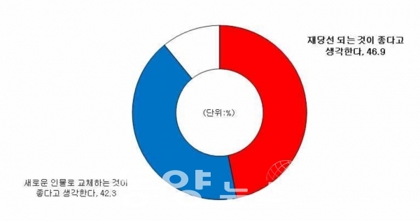 '재당선 되는 것이 좋다고 생각한다' 46.9%, '새로운 인물로 교체하는 것이 좋다고 생각한다' 42.3%. '잘모름' 10.9%.