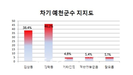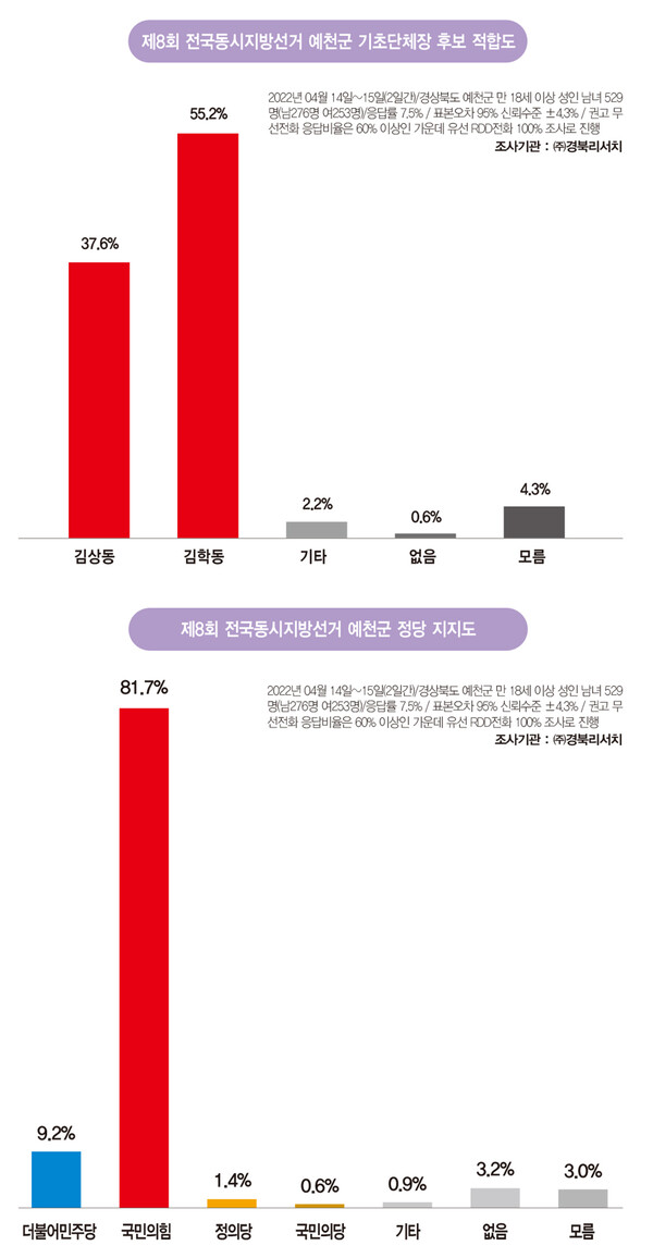 김학동 현 예천군수 55.2%, 김상동 전 예천부군수 37.6%, 모름 4.3%, 기타 2.2%, 없음 0.6%