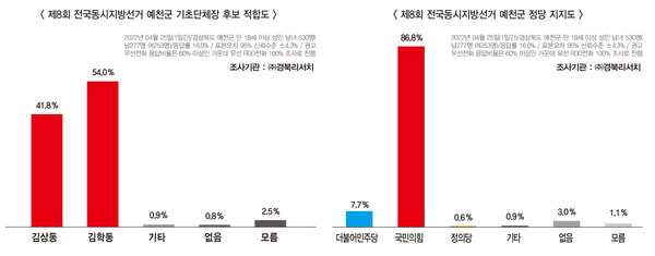 김학동 현 군수가 46.2%, 김상동 국민의힘 경북도당 부위원장 38.4%