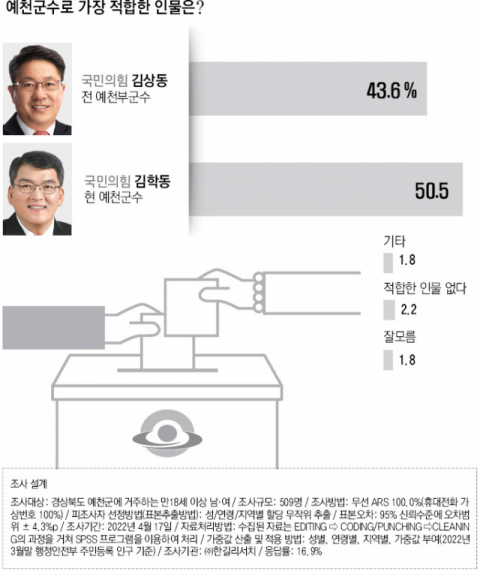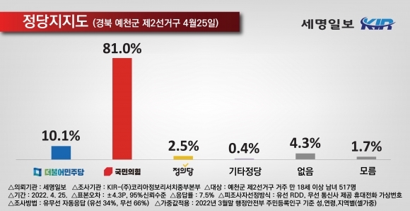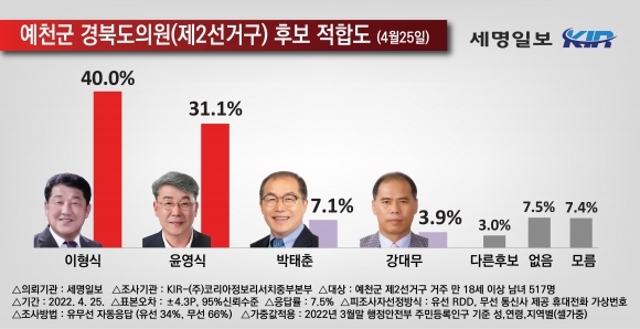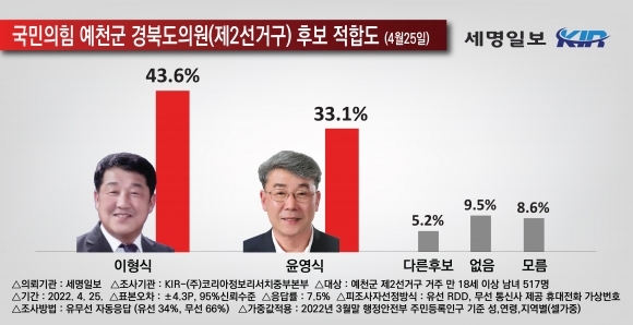 세명일보 의뢰, 코리아정보리서치 중부본부 4월 25일 예천군 제2선거구에 거주하는 만 18세 이상 성인 남녀 517명 대상 조사