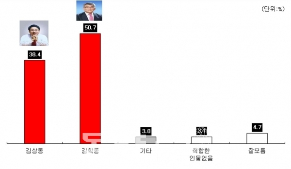 김학동 군수 50.5%, 김상동 전 부군수 43.6%, '적합 인물 없음'과 '잘모름' 등 부동층 4.0%