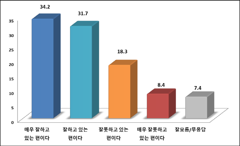 ③ 잘못하고 있는 편이다 ④ 매우 잘못하고 있는 편이다
