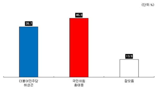 국민의힘 홍태용 46.3%, 더불어민주당 허성곤 39.7%, 잘모름 13.9%