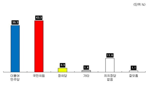 국민의힘 43.3%, 더불어민주당 39.3%, 정의당 3.3%, 기타정당 1.4%, 지지하는 정당이 없다 11.6%, 잘모름 1.1%