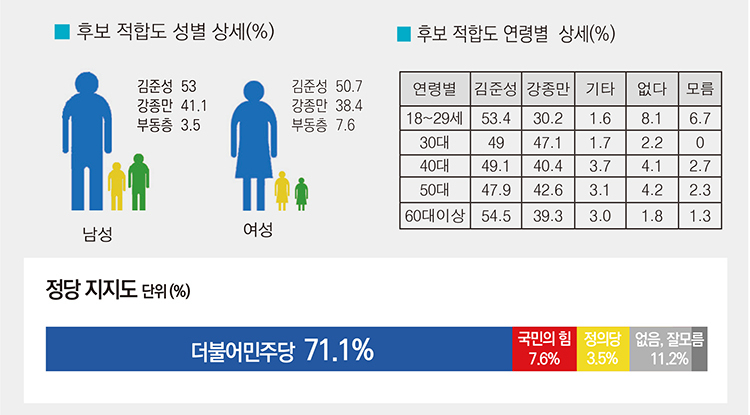 - 남성과 여성의 적합도 차이는 미세했다. 김준성 후보는 남성과 여성 모두에게서 강종만 후보를 앞섰다.