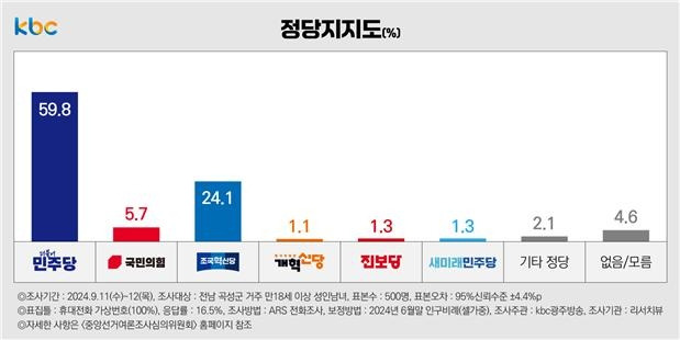 더불어민주당 59.8%, 조국혁신당 24.1%, 국민의힘 5.7%, 진보당 1.3%, 새미래민주당 1.3%, 개혁신당 1.1%