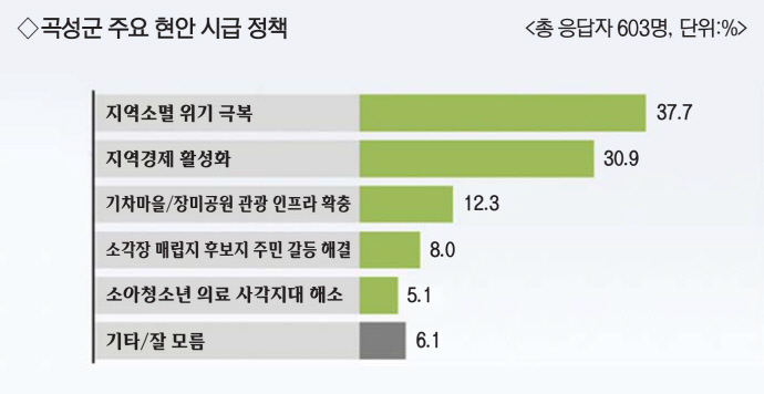 지역 소멸 위기 극복 37.7%, 지역경제 활성화 30.9%, 기차마을/장미공원 관광 인프라 확충 12.3%, 소각장 매립지 후보지 주민 갈등 해결 8.0%, 기타/잘 모름 6.1%, 소아청소년 의료 사각지대 해소 5.1%