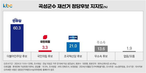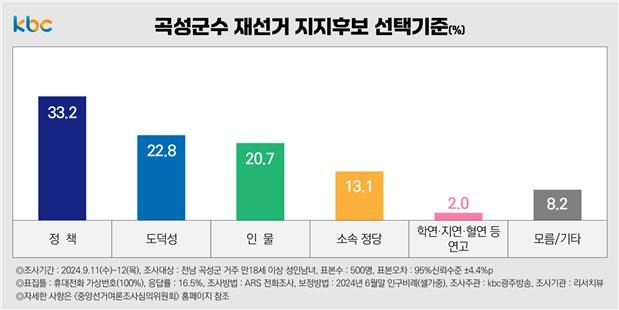 KBC 광주방송 의뢰, 리서치뷰 9월 11~12일 이틀간 전남 곡성군에 거주하는 만 18세 이상 유권자 500명 대상 조사
