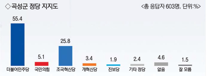 남도일보, 아시아경제 호남취재본부, 뉴스1 광주·전남본부 공동 의뢰, 리얼미터 9월 10일-11일 전남 곡성군에 거주하고 있는 만 18세 이상 603명 대상 조사