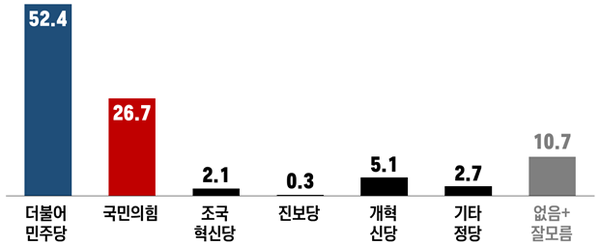 더불어민주당 52.4%, 국민의힘 26.7%, 개혁신당 5.1%, 조국혁신당 2.1%, 진보당 0.3%