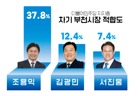 현 조용익 부천시장 24%, 서진웅 전 국무총리 정무비서관 9.5%, 김광민 대북송금사건 이화영 변호인 8.3%, 강병일 전 부천시의회 의장 2.7%, ‘없음과 잘 모름’ 43.5%