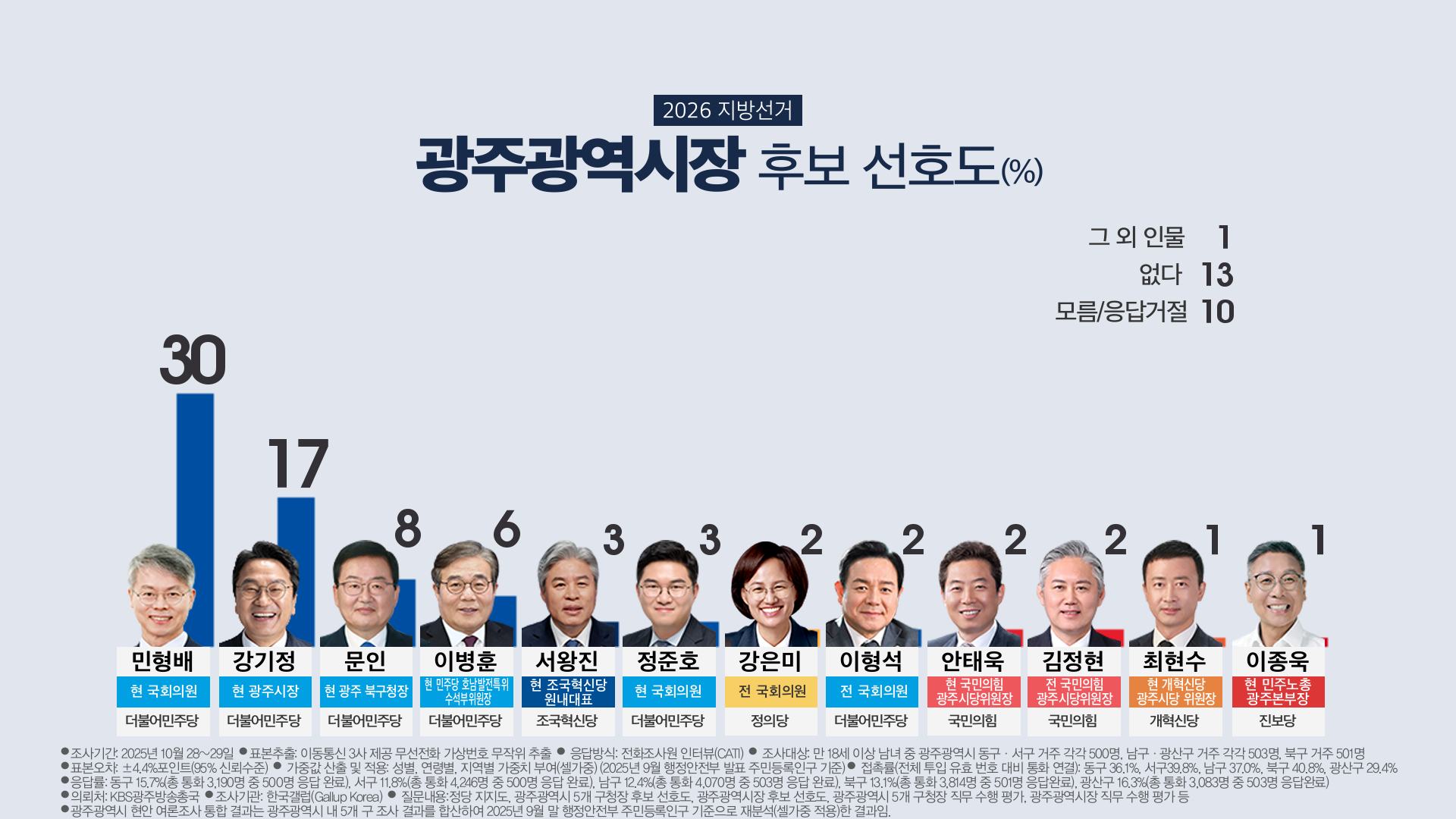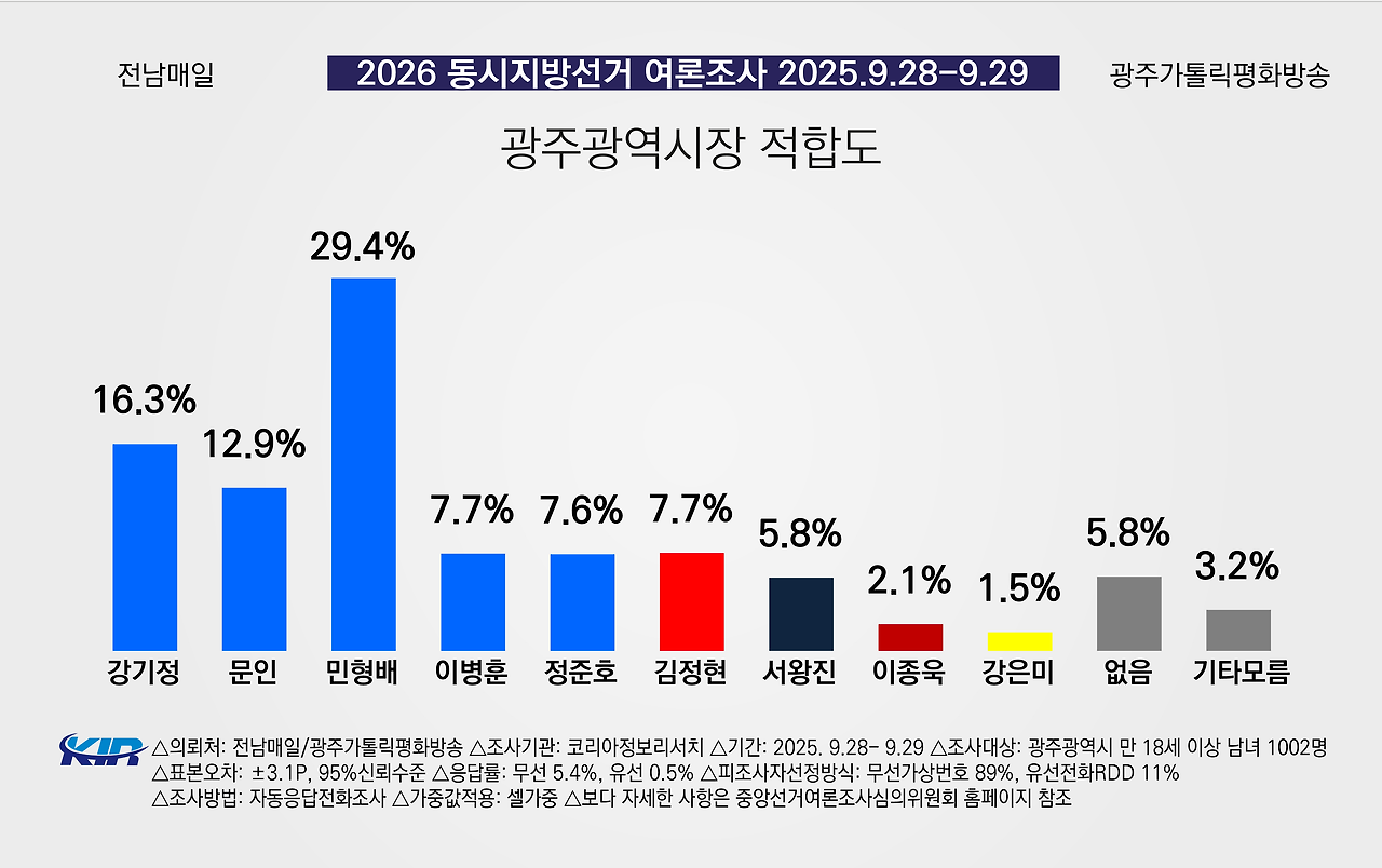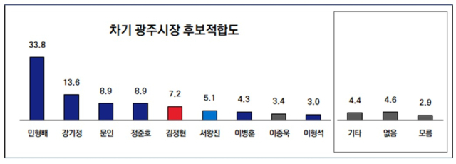 민형배 의원 33%, 강기정 시장 14%, 민주당 정준호 의원 6%, 문인 북구청장 5%, 이병훈 호남발전특위 수석부위원장 4%, 국민의힘 안태욱 광주시당위원장 2%, 조국혁신당 서왕진 의원, 국힘 강현구 동남갑당협위원장, 개혁신당 최현수 광주시당위원장, 진보당 이종욱 민주노총 광주본부장 각 1%
