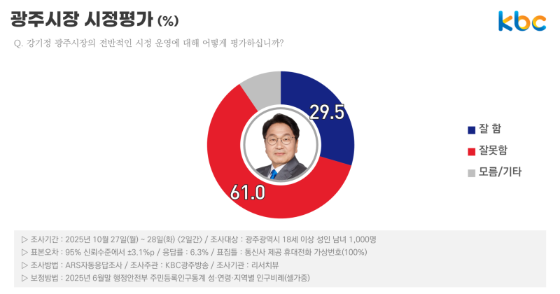 * 이번 조사는 2025년 8월 2~3일 2일간 광주광역시 거주 만 18세 이상 남녀 대상으로 ARS 여론조사(휴대전화 100% 가상번호 방식, 성, 연령대, 지역별 비례할당 무작위 추출)를 실시한 결과이며, 표본수는 803명(총 통화시도 11,969명, 응답률 6.7%), 표본오차는 95% 신뢰수준에 ±3.5%포인트이다. 통계보정은 2025년 7월말 행정안전부 주민등록인구 기준, 성·연령·지역별 가중치 부여 방식(림가중)으로 이뤄졌다. 자세한 내용은 중앙선거여론조사심의위원회 홈페이지를 참조하면 된다.