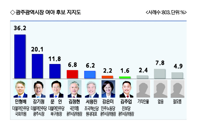 민주당 민형배 국회의원 36.2%, 강기정 시장 20.1%, 민주당 문인 북구청장 11.8%, 김정현 국민의힘 광주시당 위원장 6.8%, 서왕진 조국혁신당 원내대표 6.2%, 강은미 민주노동당 광주시당 위원장 2.2%, 김주업 진보당 광주시당 위원장 1.6%, 기타인물 2.4%, 없음 7.8%·잘 모름 4.9%