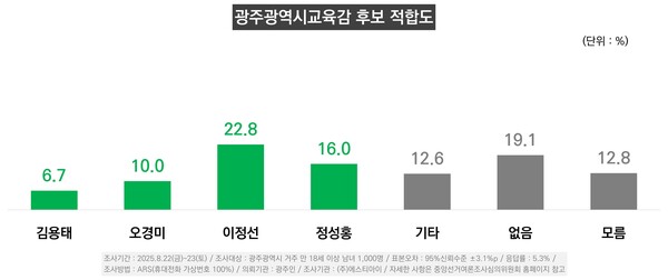 김용태 전 노무현재단 광주지역위 시민학교장 21.5%, 이정선 현 교육감 21.2%, 정성홍 전 전교조 광주지부장 12.6%, 오경미 전 광주시교육청 교육국장 6.9%, 기타 인물 5.4%, ‘지지하는 후보 없음’ 11.4%, ‘잘 모름’ 21.1%