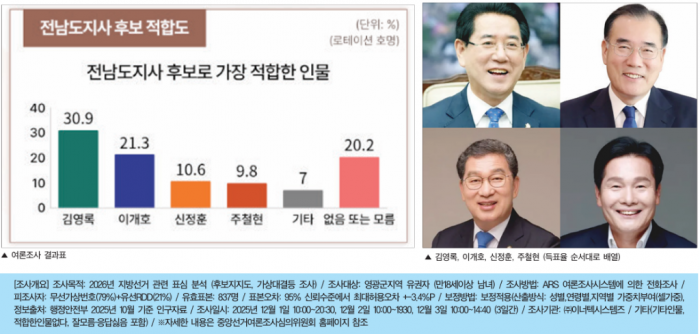 김영록 전남지사 26.3%, 주철현 의원 16.3%, 신정훈 의원 15.9%, 이개호 의원 9.5%