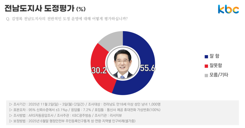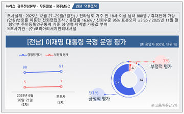 * 이번 조사는 무등일보가 뉴시스 광주전남취재본부, 광주MBC 등과 공동으로 여론조사 전문기관 코리아리서치에 의뢰해 지난 20일부터 2일간 전남지역에 거주하는 만 18세 이상 남녀 802명(응답률 17.2%)을 대상으로 조사했다. 휴대폰 가상번호를 이용한 무선전화면접 100% 방식으로 진행했으며, 2025년 5월 말 행정안전부 발표 주민등록 인구 기준으로 지역별·성별·연령별 가중치를 부여(셀가중)했다. 표본오차는 95% 신뢰수준에서 ±3.5%p다. 자세한 내용은 중앙선거여론조사심의위원회 홈페이지를 참조하면 된다.