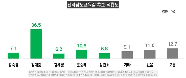 김대중 현 교육감 36.5%, 문승태 현 순천대 대외협력 부총장 10.6%, 강숙영 전 전남교육청 장학관 7.1%, 장관호 현 전남교육연구소 이사장 6.8%, 김해룡 현 전남교육대전환포럼 상임대표 6.2%