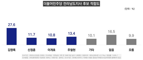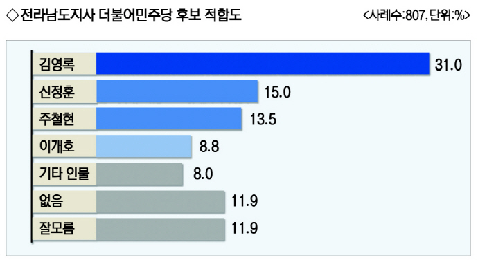 김영록 지사 31.0%, 신정훈 의원 15.0%, 주철현 13.5%, 이개호 8.8%, ‘기타 인물’ 8.0%, ‘없음’과 ‘잘 모름’ 각 11.9%