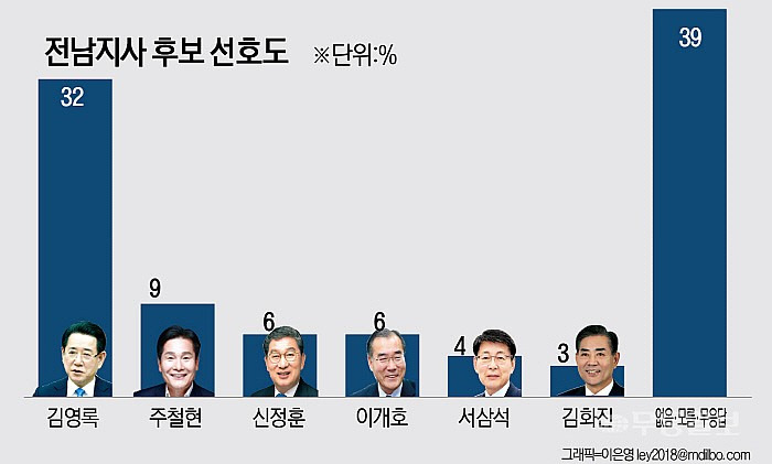 김영록 지사 32%, 주철현 국회의원 9%, 신정훈 국회의원 6%, 이개호 국회의원 6%, 서삼석 국회의원 4%, 김화진 국민의힘 도당위원장 3%, 기타 후보 0%, '없음·모름·무응답' 39%