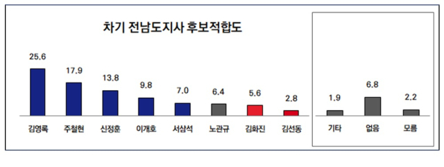 - 도지사 후보별로는 김영록 지지자 6.5%, 신정훈 지지자 8.2%, 이개호 지지자 14.7%, 주철현 지지자 1.7%, 김화진 지지자 8.0%, 민점기 지지자 3.2%, 노관규 지지자 6.0%가 지지했다.