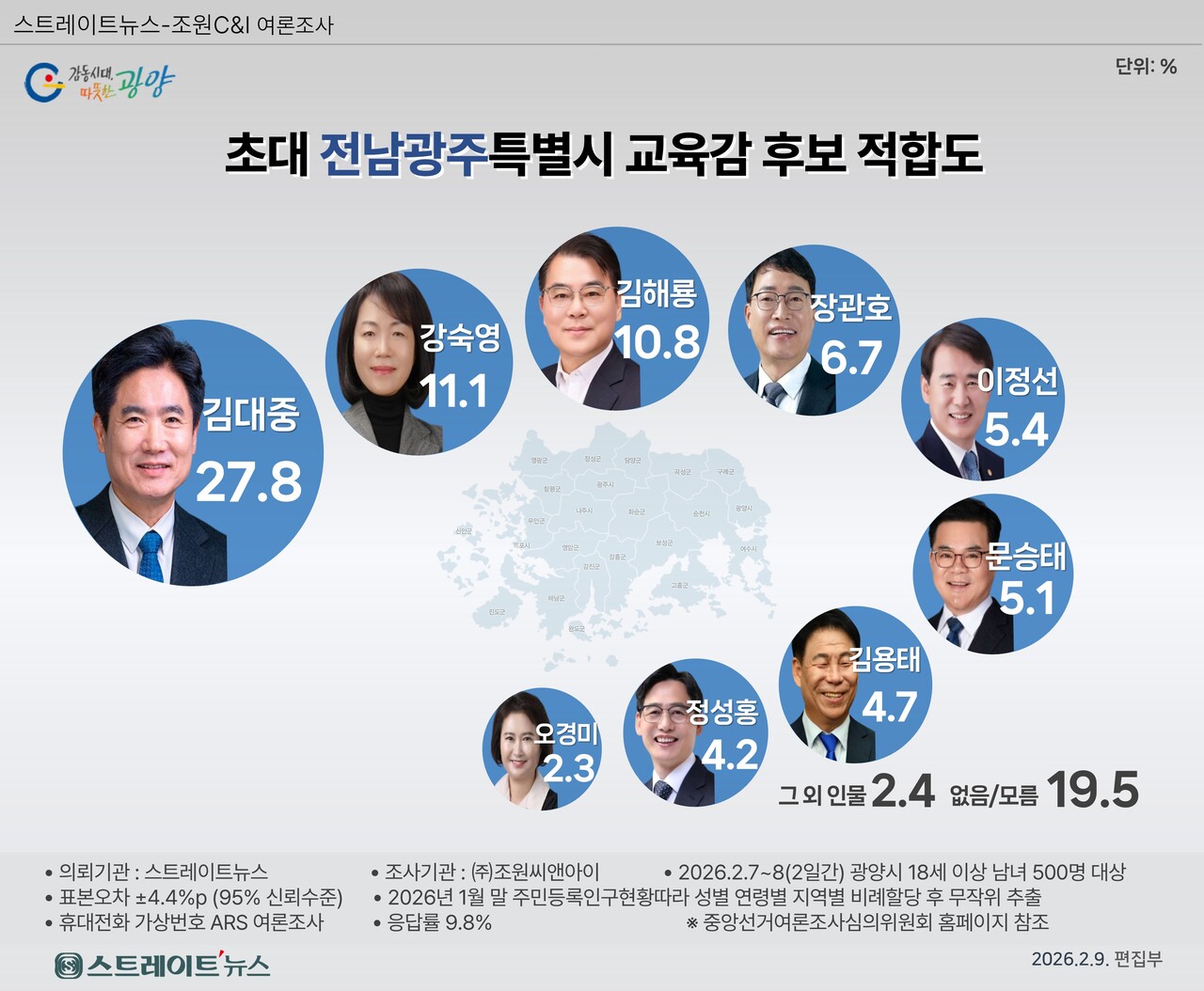 * 이번 조사는 스트레이트뉴스 의뢰로 조원씨앤아이가 2026년 2월 7~8일 2일간 전라남도 광양시 거주 18세 이상 남녀 대상으로 ARS 여론조사(휴대전화 가상번호 100%, 성, 연령대, 지역별 비례할당 무작위 추출)를 실시한 결과다. 표본수는 500명(총 통화시도 5123명, 응답률 9.8%), 표본오차는 95% 신뢰수준에 ±4.4%p다. 그 밖의 사항은 중앙선거여론조사심의위원회 홈페이지 참조.