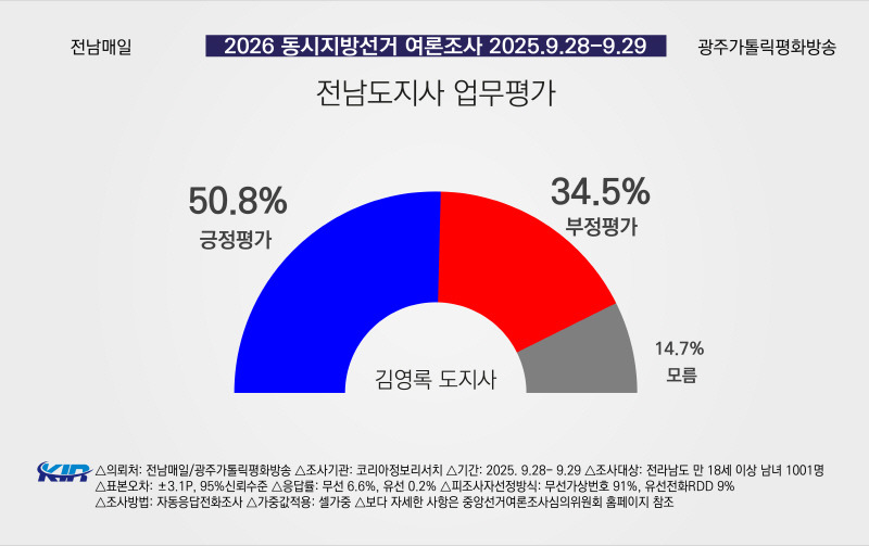 * 이번 조사는 전라남도 거주 만 18세 이상 남녀 803명을 대상으로 8월 31일부터 9월 1일까지 구조화된 설문지를 이용한 무선 ARS 방식으로 진행됐다. 표본오차는 95% 신뢰수준에서 ±3.5%포인트이며, 응답률은 5.9%다.