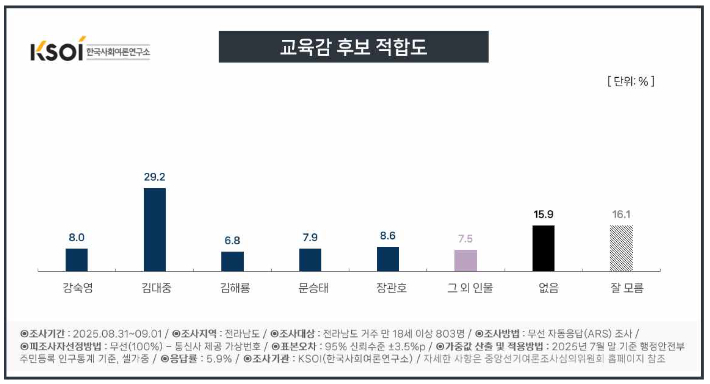 김대중 전남도교육감 20.8%, 이정선 광주시교육감 9.8%, 정성홍 전 전교조 광주지부장 7.7%, 김용태 전 전교조 광주지부장 7.2%, 오경미 전 광주시교육청 교육국장 7.1%, 김해룡 전 전남여수교육지원청 교육장 6.7%, 문승태 순천대 대외협력 부총장 5.9%, 장관호 전 전교조 전남지부장 5.7%, '그 외 인물' 6.7%, '없음·잘 모름' 22.5%