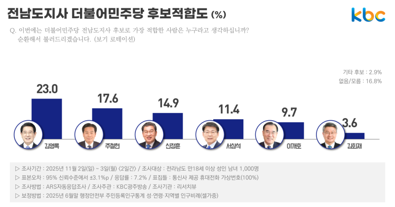 - 반면, 전남에서는 김영록 지사가 24%로 높은 선호도를 보였고, 민형배 의원과 신정훈 국회 행정안전위원장, 주철현 의원이 그 뒤을 이었습니다.