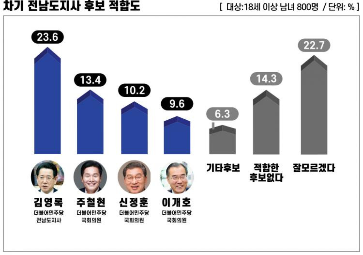 현 김영록 도지사 23.6%, 주철현 의원 13.4%, 신정훈 의원 10.2%, 이개호 의원 9.6%, 기타 후보 6.3%, 적합한 후보가 없다 14.3%, 잘 모르겠다가 22.7%