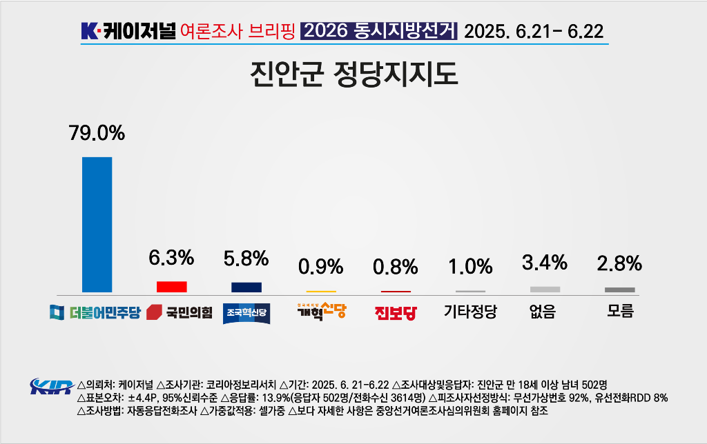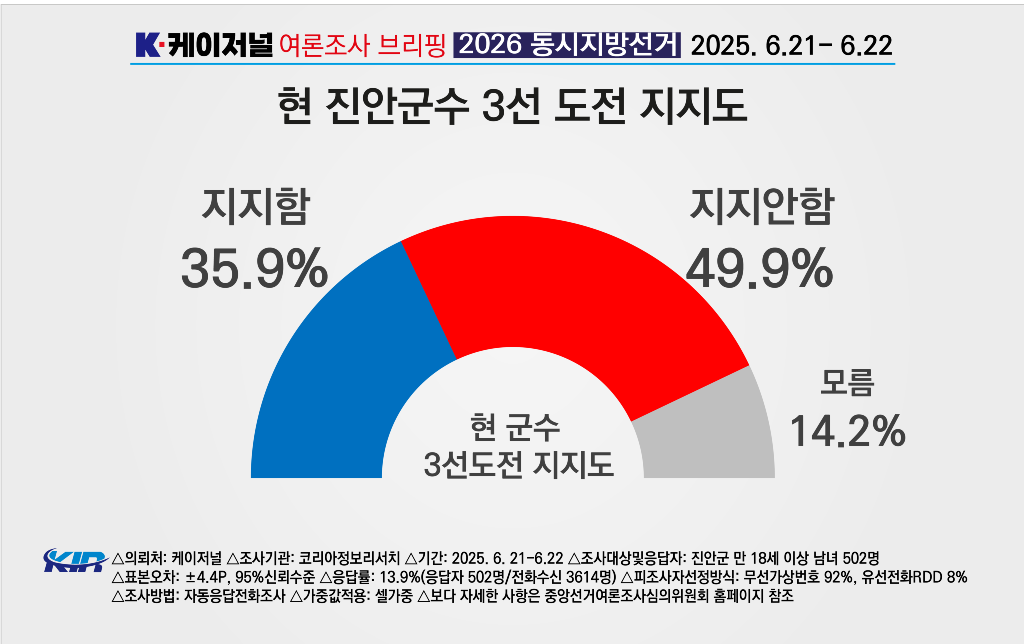 케이저널 의뢰, 코리아정보리서치 2025년 6월 21일-22일 전북특별자치도 진안군민 만 18세 이상 남녀 502명 대상 조사