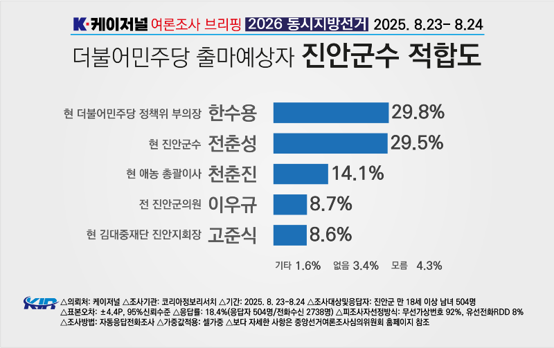 케이저널 의뢰, 코리아정보리서치 2025년 8월 23~24일 진안군 거주 만 18세 이상 504명 대상 조사