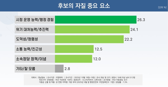 '시정 운영 능력 및 행정 경험' 26.3%, '위기 대처 능력 및 추진력' 24.1%, '도덕성 및 청렴성' 22.2%, '소통 능력 및 친근성' 12.5%, '소속 정당 정책 및 이념' 12.0%