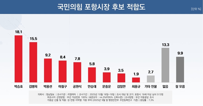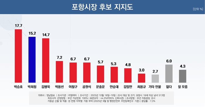 박승호 전 시장 17.7%, 박희정 시의원 15.2%, 김병욱 전 의원 14.7%, 국민의힘 박용선 경북도의원 7.2%, 이칠구 경북도의원 6.7%, 공원식 전 경북도 정무부지사 6.7%, 문충운 전 여의도연구원 정책자문위원 5.7%, 안승대 울산시 행정부시장 5.3%, 김일만 포항시의회 의장 4.8%, 최용규 법무법인 도울 대표변호사 3.0%, 지지 후보가 '없다' 6%, '잘 모르겠다' 4.3%