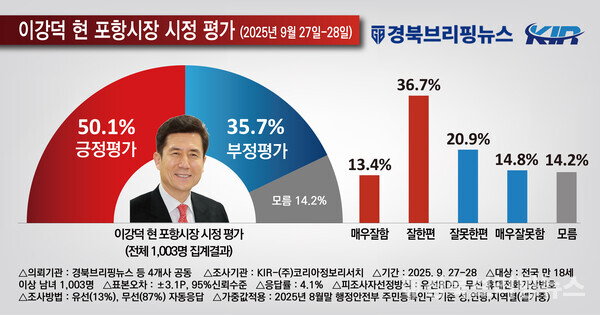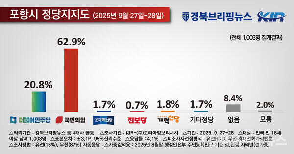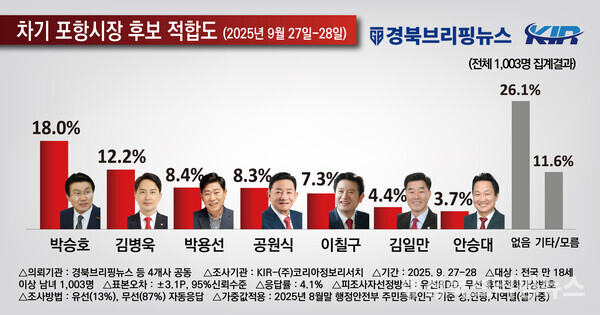 경북브리핑뉴스, 딜사이트경제TV 대구경북취재본부, NSP통신 대구경북취재본부, 아이뉴스24 대구경북취재본부 공동 의뢰, 코리아정보리서치 2025년 9월 27일-28일 포항시 거주 만 18세 이상 남녀 1003명 대상 조사