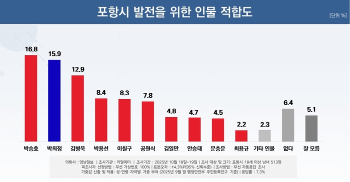 박승호 전 시장 16.8%, 더불어민주당 박희정 포항시의원 15.9%, 국민의힘 김병욱 전 국회의원 12.9%, 국민의힘 박용선 경북도의원 8.4%, 이칠구 경북도의원 8.3%, 공원식 전 경북도 정무부지사 7.8%, 국민의힘 김일만 포항시의회 의장 4.8%, 안승대 울산시 행정부시장 4.7%, 문충운 전 여의도연구원 정책자문위원 4.5%, 최용규 법무법인 도울 대표변호사 2.2%, '기타 인물' 2.3%, '없음' 6.4%, '잘 모름' 5.1%