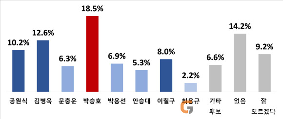박승호 전 포항시장 20.0%, 김병욱 전 국회의원 16.3%, 공원식 전 경북도 정무부지사 13.2%